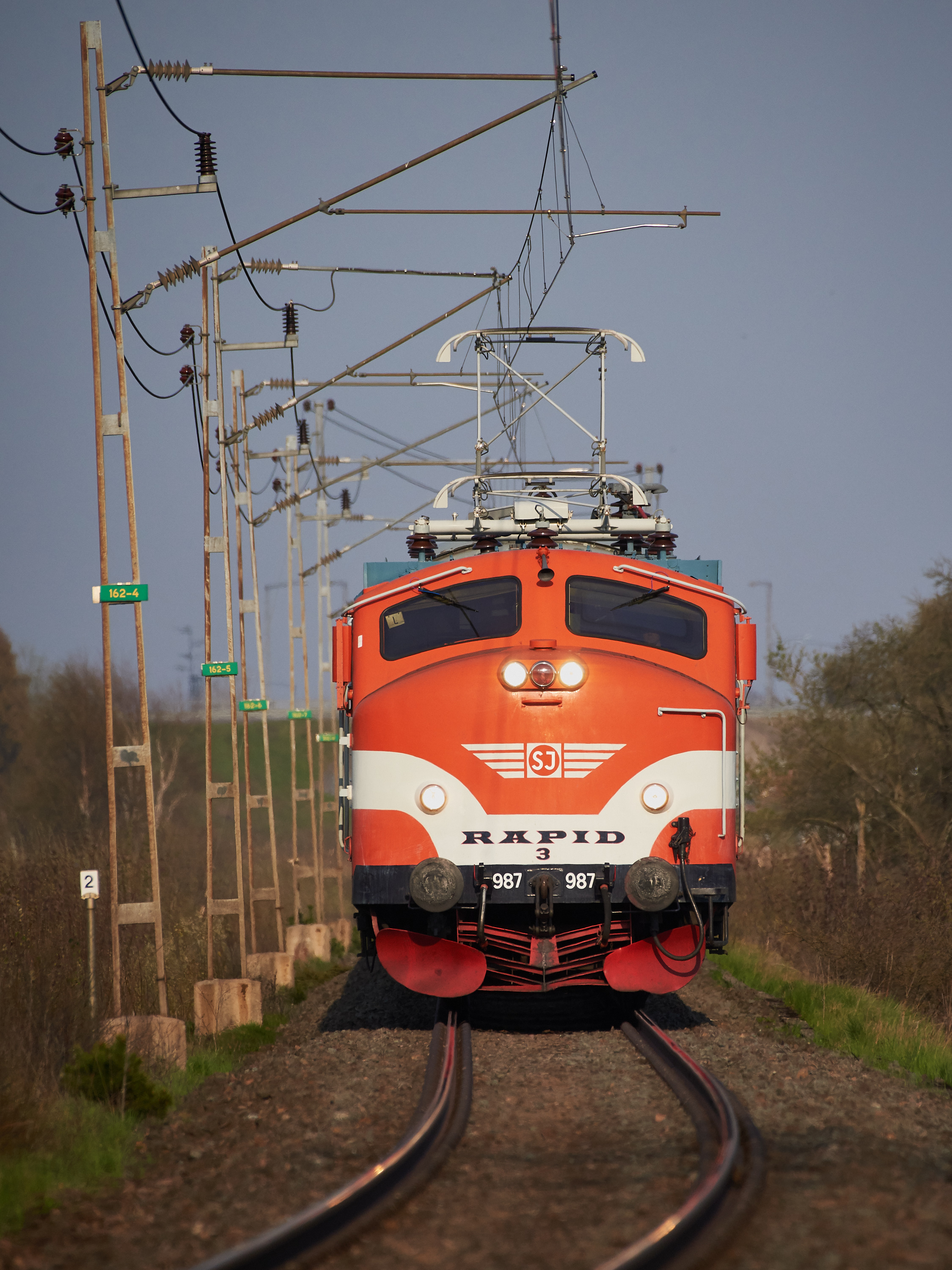 Someting completely different. The Ra 987, Rapid 3, built in 1961, 10 minutes after leaving Kalmar Central Station at 17:47 on April 28th 2018. The Ra-type was ordered by Statens Järnvägar, Sweden, in 1952. The design is clearly inspired by the GM EMD F an E types intended to show the high speed capability of the Ra.