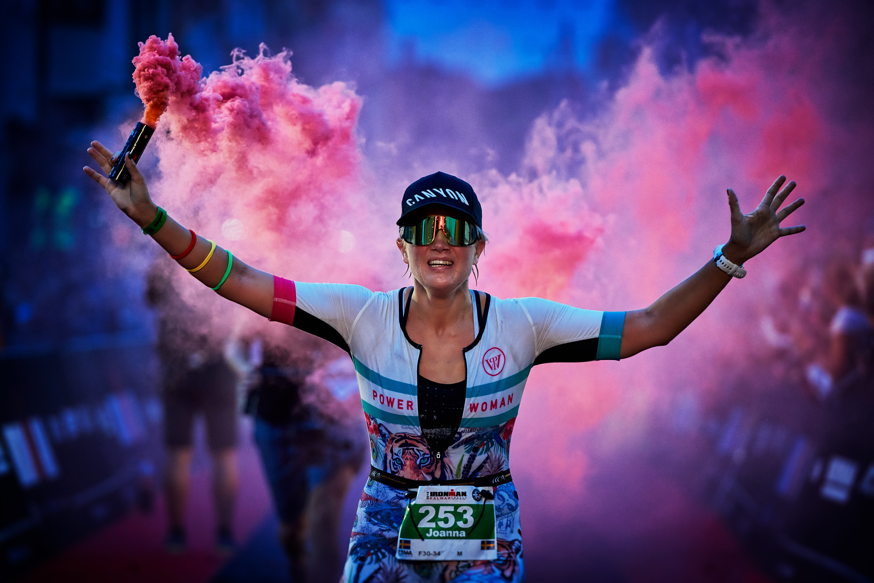 🇸🇪 Mot mål. Prisceremonin är över och vinnarna har sedan länge lämnat området. Detta är upploppet för de andra, de som inte tillhör de professionellas skara. Deltagarna har simmat, cyklat och avslutar nu med ett marathonlopp. I mer än tolv timmar har de varit igång. Detta är deras ögonblick av triumf nu när de de sista tio meterna återstår av tävlingen. Publiken hurrar och hejar när löparna närmar sig uppropet.