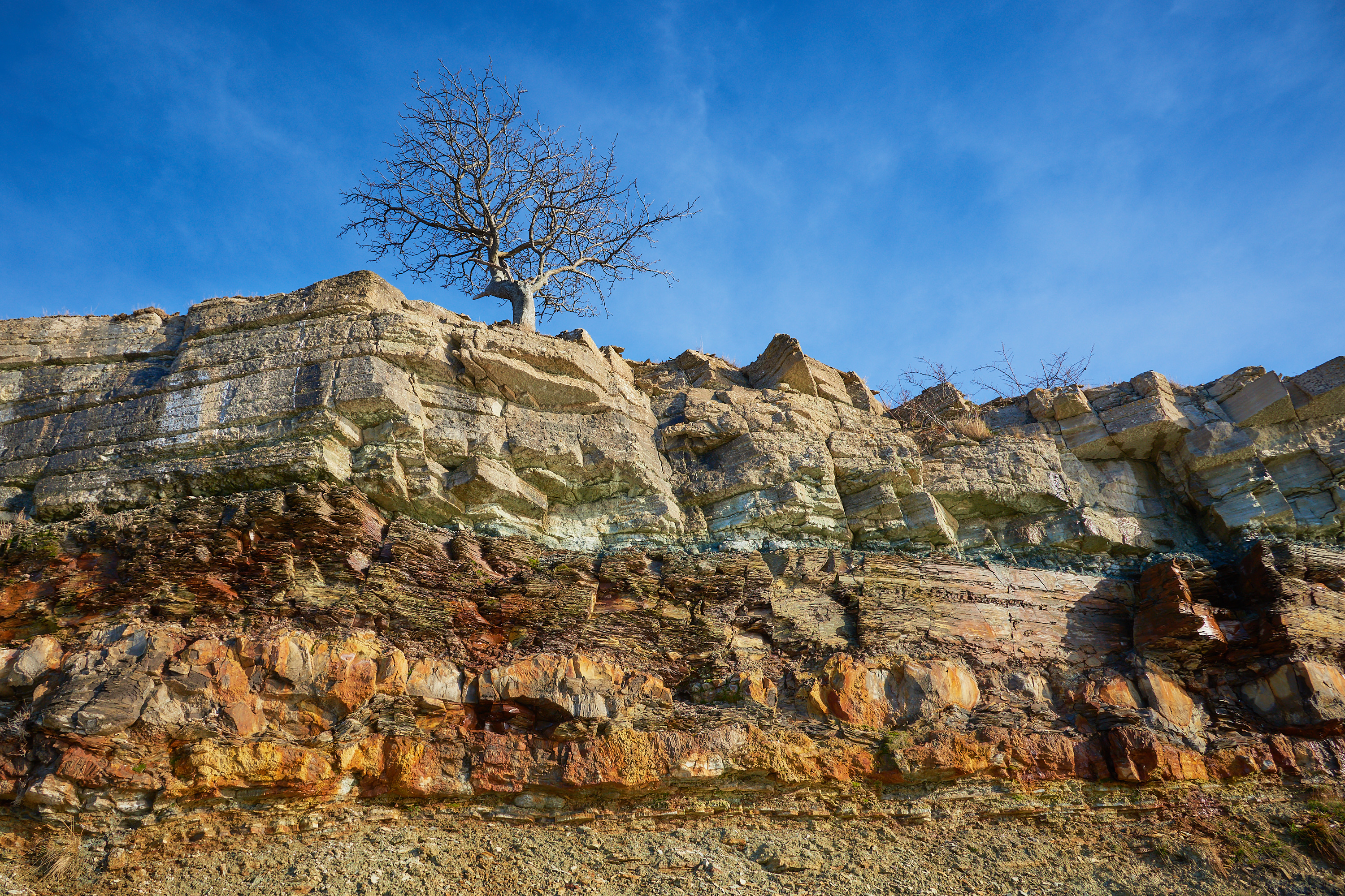 🇬🇧 A tree grows at the top of the mighty western cliff coast of NW Öland, Sweden’s second largest island. The place where the tree has settled its roots is not an easy place to grow. The soil is thin, the precipitation is sparse and the wind from the sea blows more or less relentlessly through the branches. The cliff beneath the tree is striped with the top layers of the bedrock that constitutes the island. At the very top is limestone, the stone that has contributed to the livelihoods of many over the centuries as limestone from Öland is found in many buildings in Northern Europe. Below the limestone is a layer of alum shale blended with anthraconite, also called stinkstone because it smells of petroleum when breaking apart. The top layers rest on a thick layer of gray clay slate and beneath, far below the ground surface, lies the sandstone.