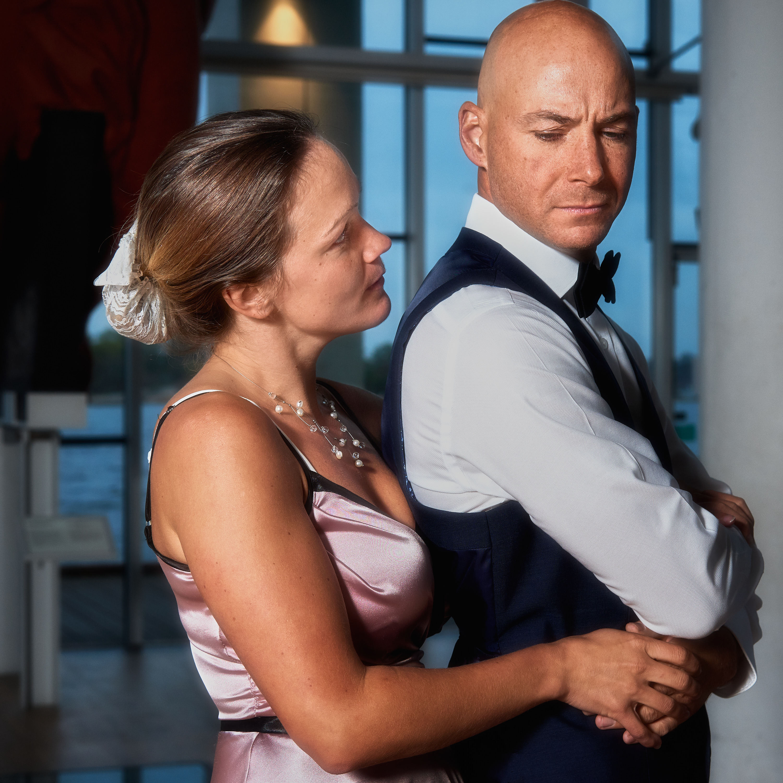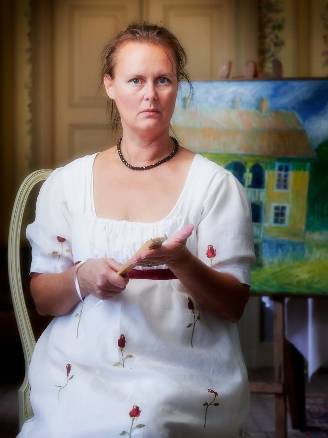 The setting is in a long corridor in the basement lit by fluoroscent tubes. White balance set to incandescent and the exposure manually set to EV -0.7. A speedlight – SB 910 – with a cto-gel pointing into the white wall to the left and in front of Åsa and Ella (the dog) in order to get a large reflecting area. Flash radio controlled from the camera.