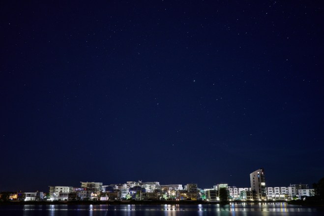 Kalmarsund and the starry sky photographed from Kalmar just south of Kalmar castle. Click on picture for a larger version – the stars become more visible at a larger view.
