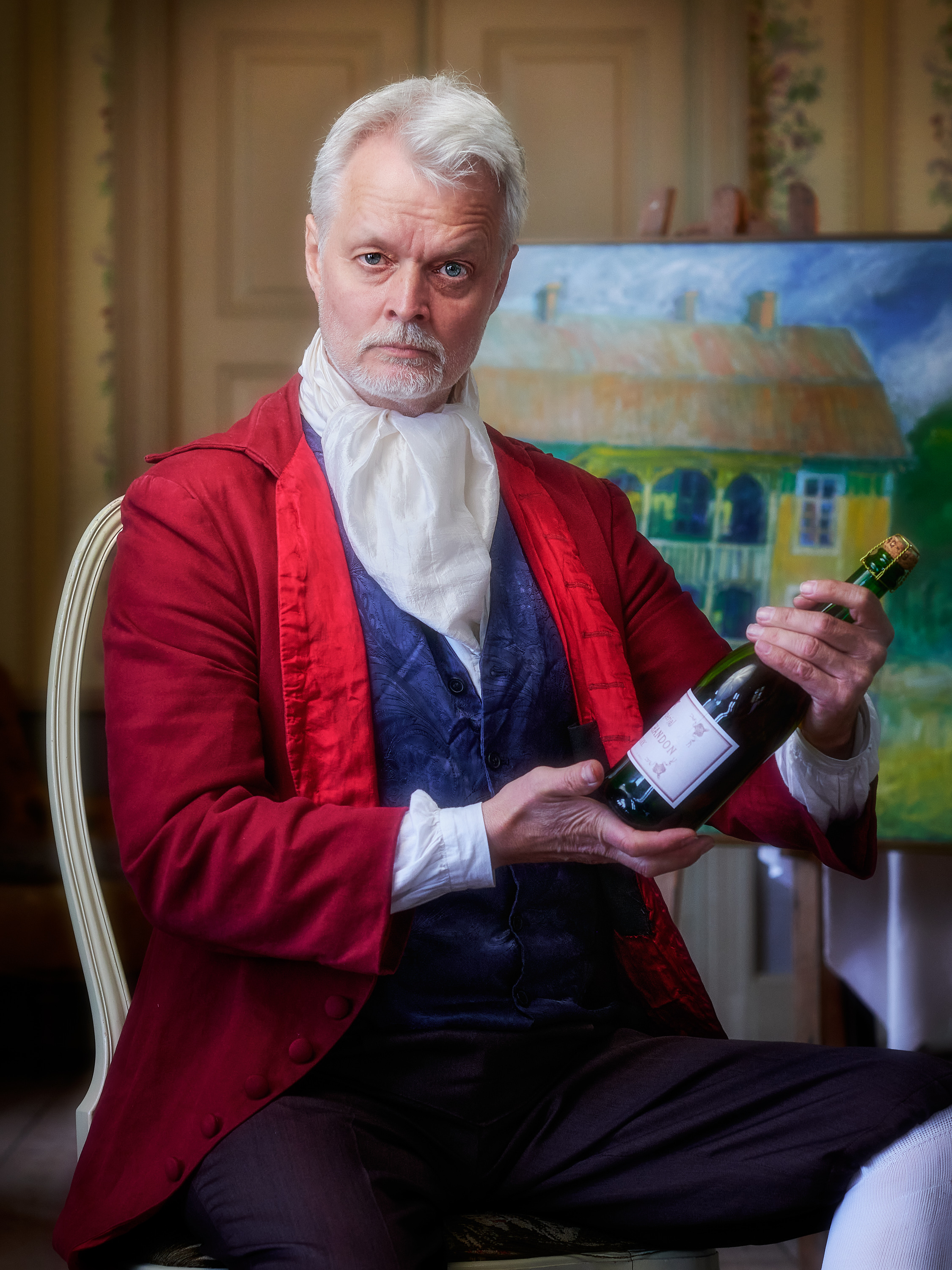 The main light comes from a small softbox at the top right controlled by the camera via radio TTL. The blue light on the wall, intended to create some drama, comes from a manually controlled flash set to full power, also controlled by the camera via radio link.