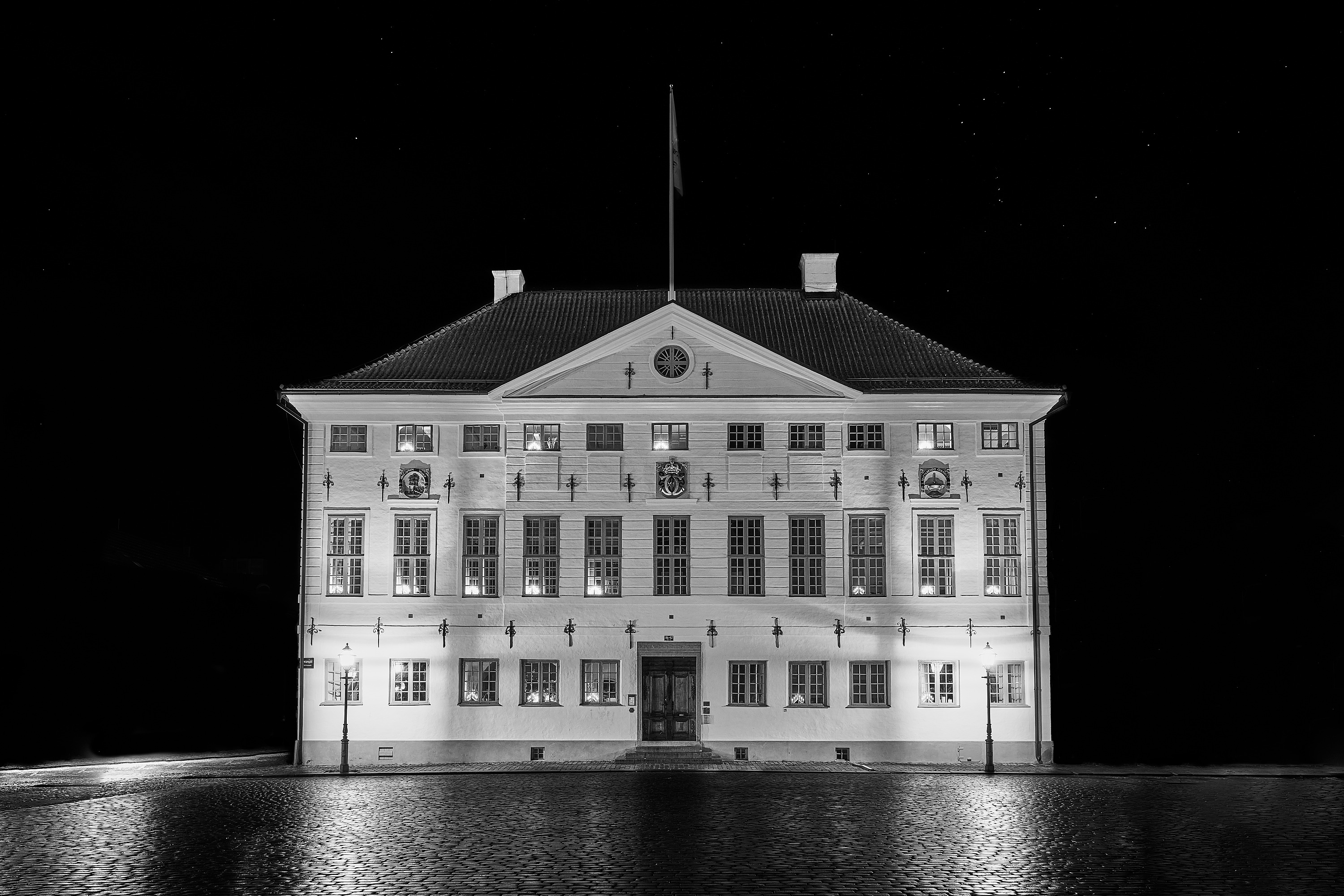🇬🇧 Kalmar Town Hall photographed around midnight a night in December 2020. The architect was probably Magnus Gabriel Craelius, who died in 1693. Karl XI:s royal cypher decorates the front wall. Surrounding houses have been removed i Affinity Photo. Click on picture for a larger version. ©Tom Gagner