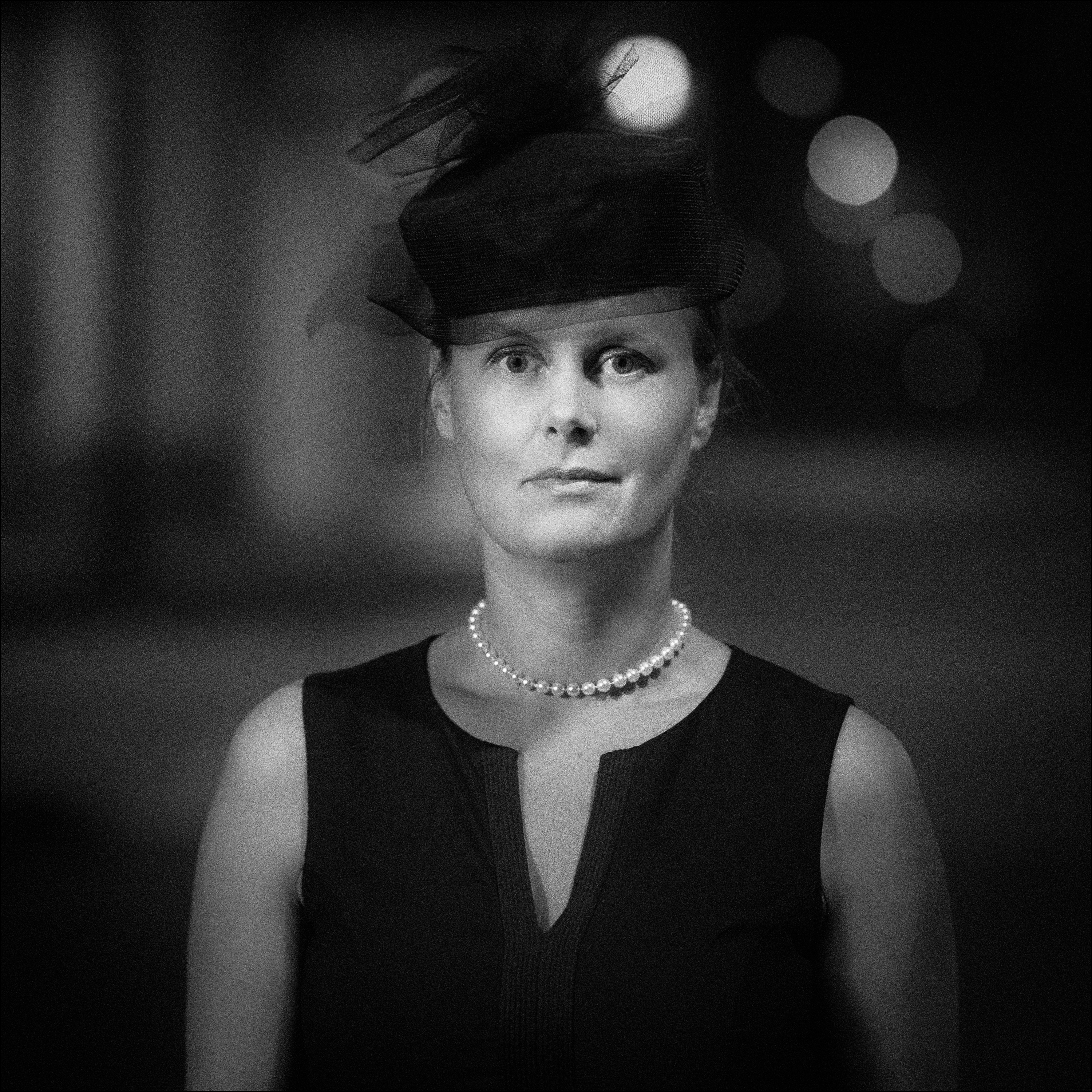 Lighting: Ambient light and one flash, SB5000 with a small softbox at the top right controlled by the camera via the radio TTL. The background, the back street Wells Mews, is underexposed with one step.